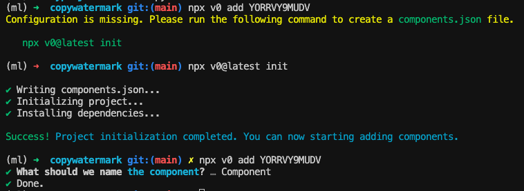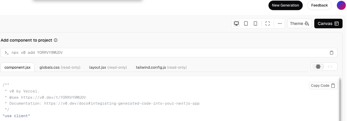 复制 CLI 命令:单击右上角的“代码”按钮,然后复制 CLI 命令,例如npx v0@latest add [id]。 在您的项目中运行命令:在您的终端中导航到您的 React 项目的根目录并粘贴复制的终端命令。