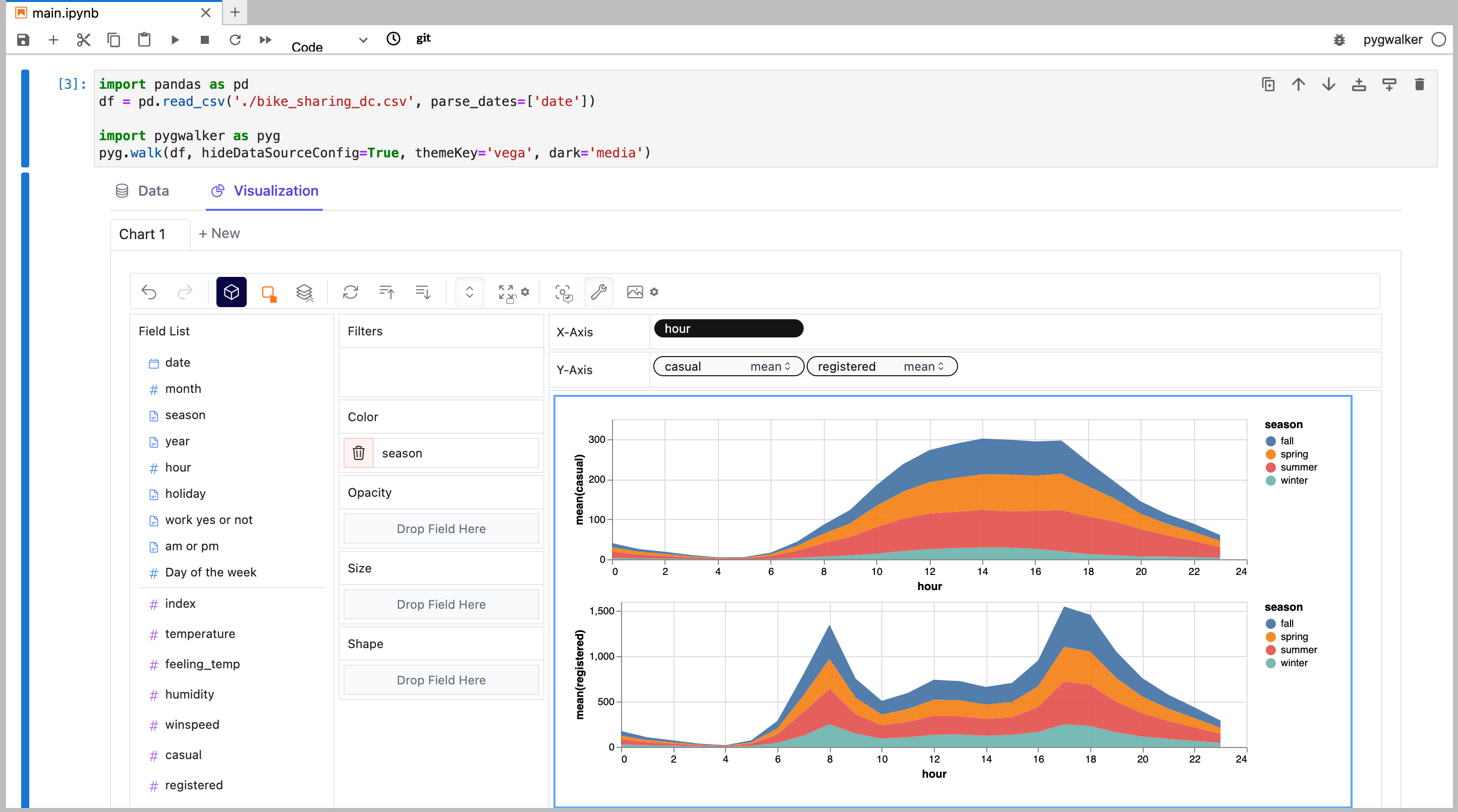 PyGWalker 是个在 Jupyter Notebook 环境中运行的可视化探索式分析工具,仅一条命令即可生成一个可交互的图形界面,以类似 Tableau/PowerBI 的方式,通过拖拽字段进行数据分析。