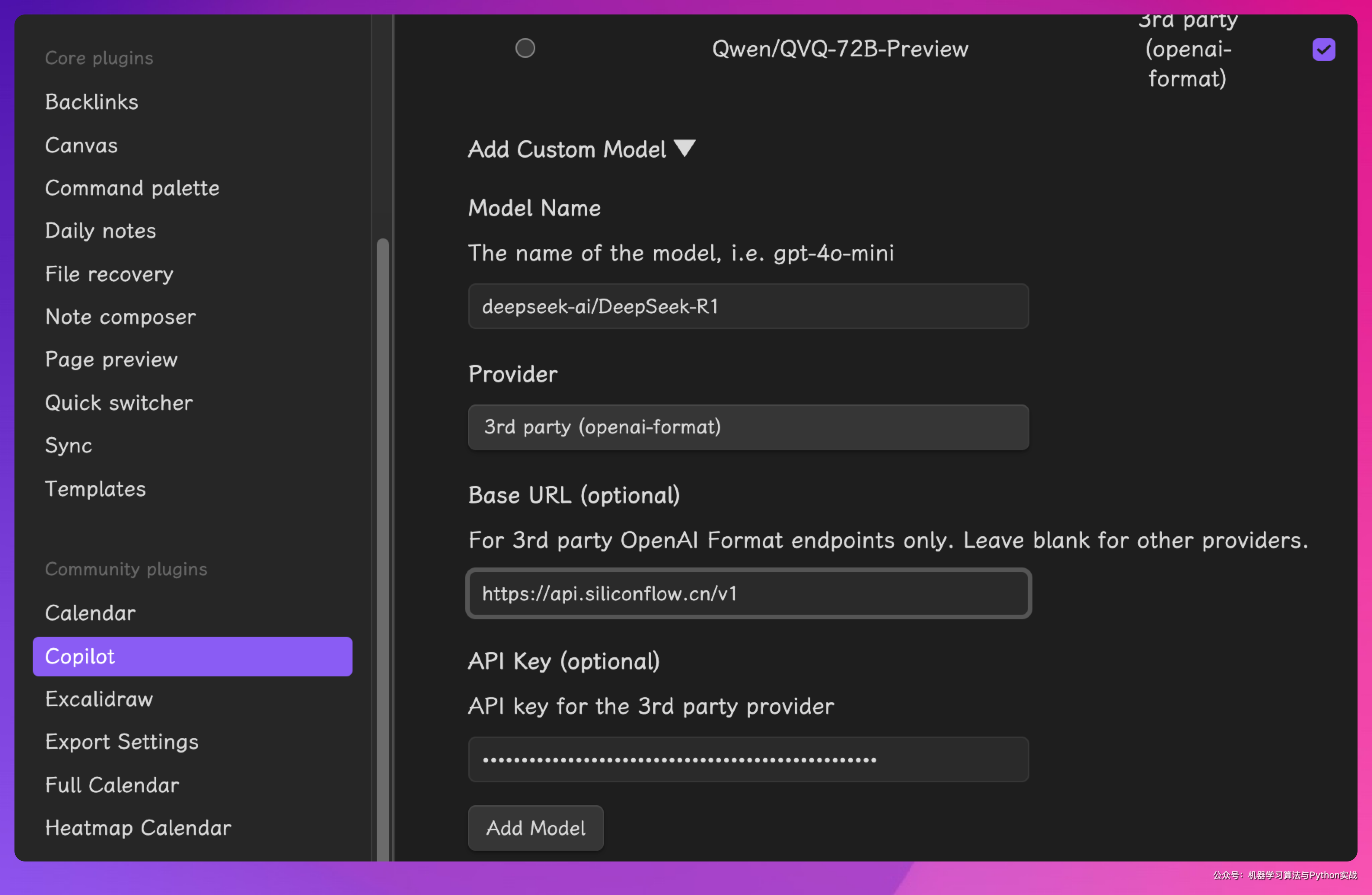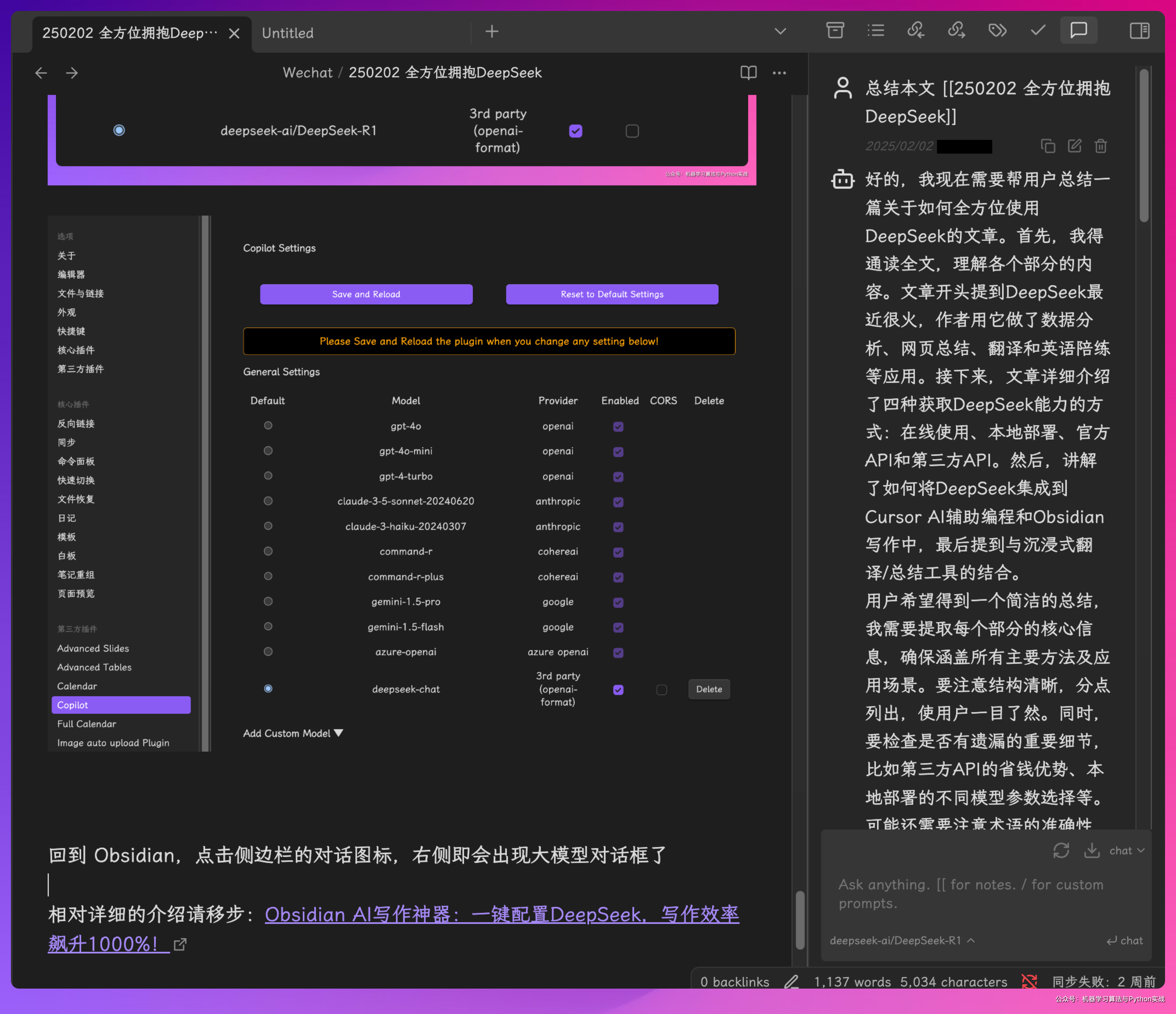相对详细的介绍请移步:Obsidian AI 写作神器:一键配置 DeepSeek,写作效率飙升 1000%!