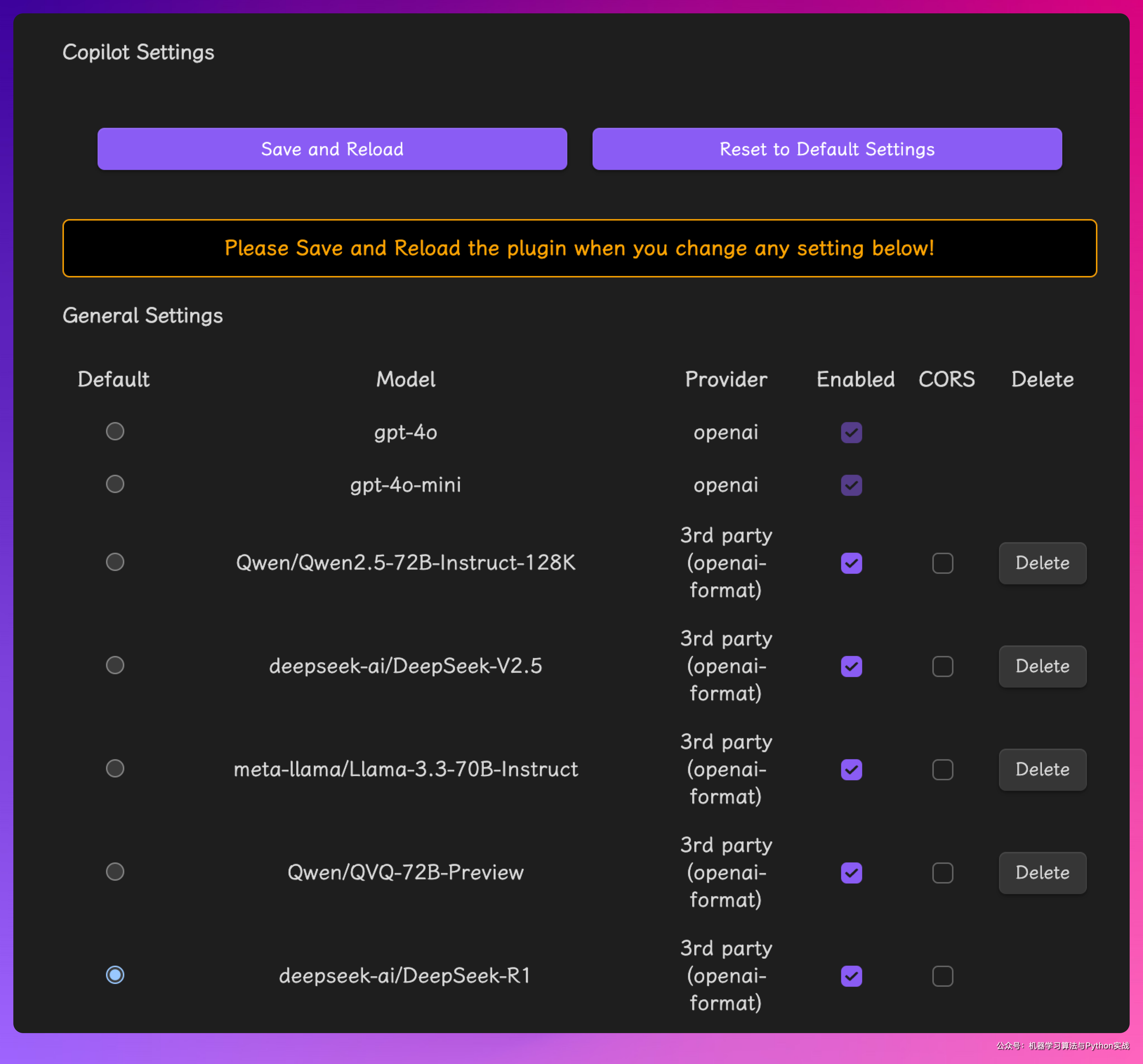 设置页面往上托,把 deepseek-ai/DeepSeek-R1 设置为默认,点击上面的 Save and Reload
