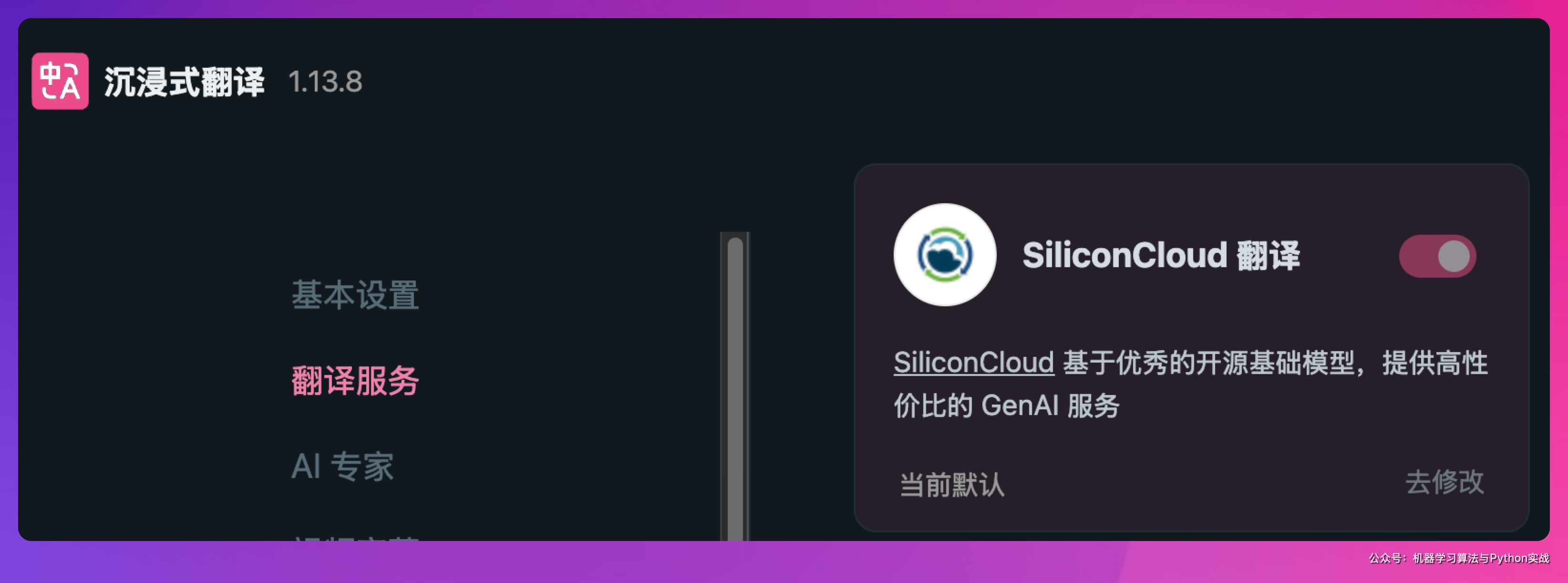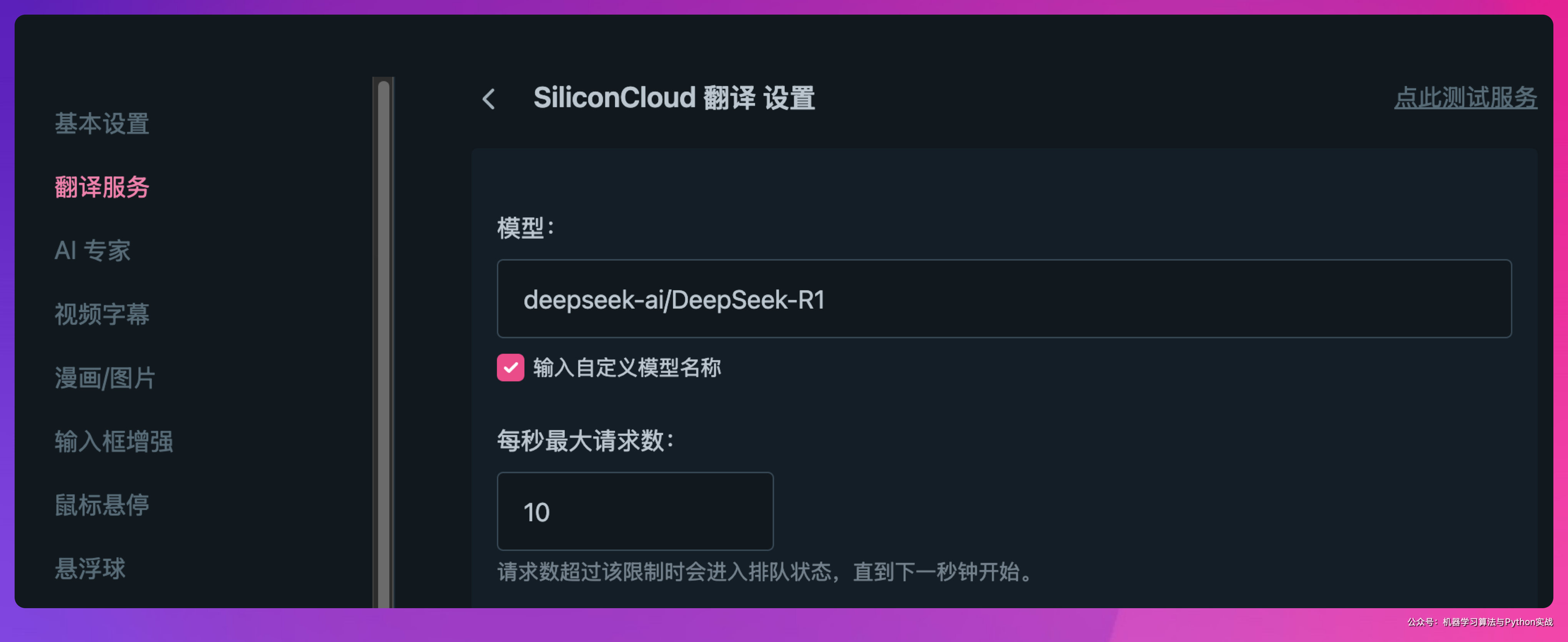 这里面翻译服务有很多,支持各种大模型,这里我们选择 DeepSeek 或 Siliconflow,当然你可以选别的,这里我选的是 Silicon