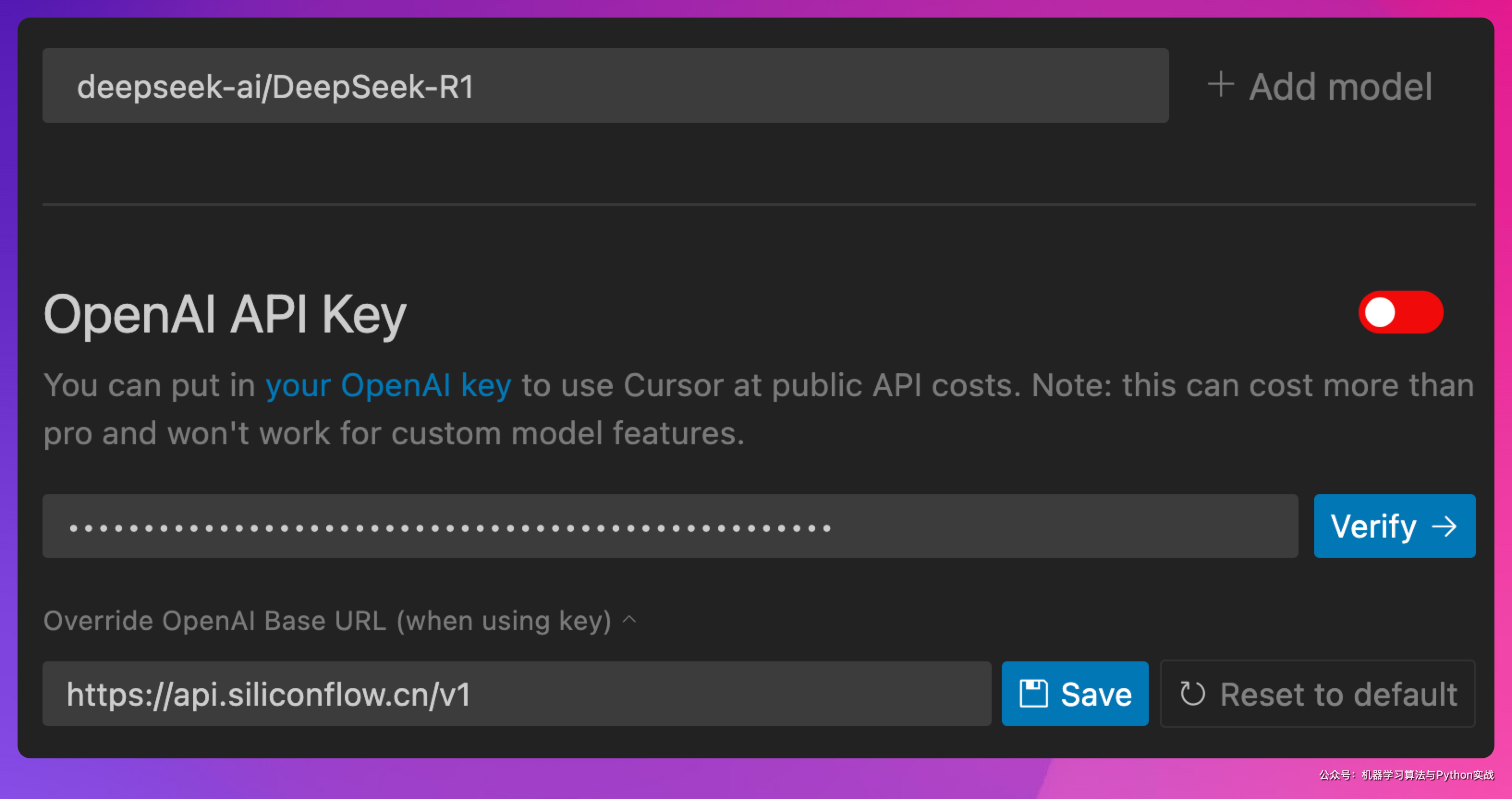 在Cursor Settings-Models中关闭其他模型,添加上面复制好的模型,点击Add model