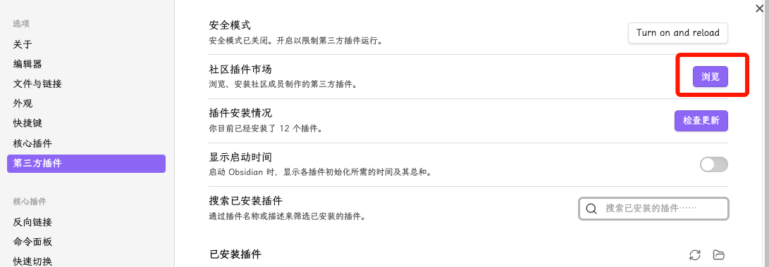 安装后,点击左下角设置,在【第三方插件】选择浏览【社区插件市场】