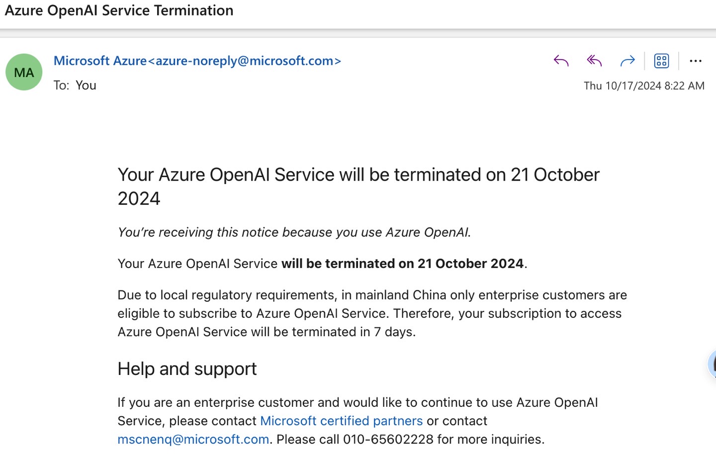 大致意思,Azure 将在2024年10月21日不再向个人提供OpenAI API服务