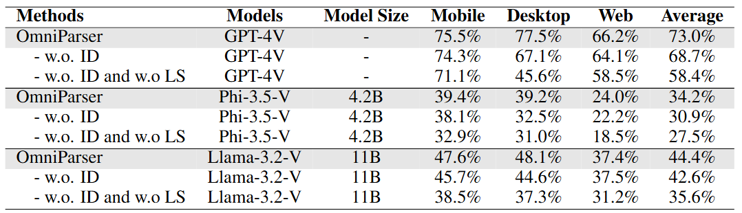 特别值得注意的是,仅使用截图输入的 OmniParser 性能超过了需要额外信息的 GPT-4V 基线模型。
