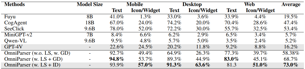 OmniParser 在多个基准测试中都展现出优秀表现: