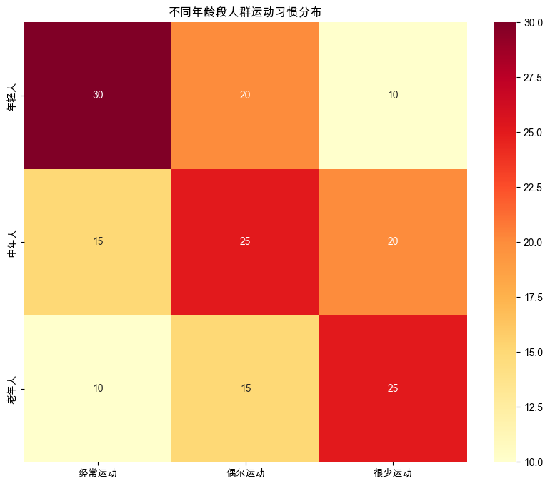 # 创建示例数据:调查不同年龄段人群的运动习惯