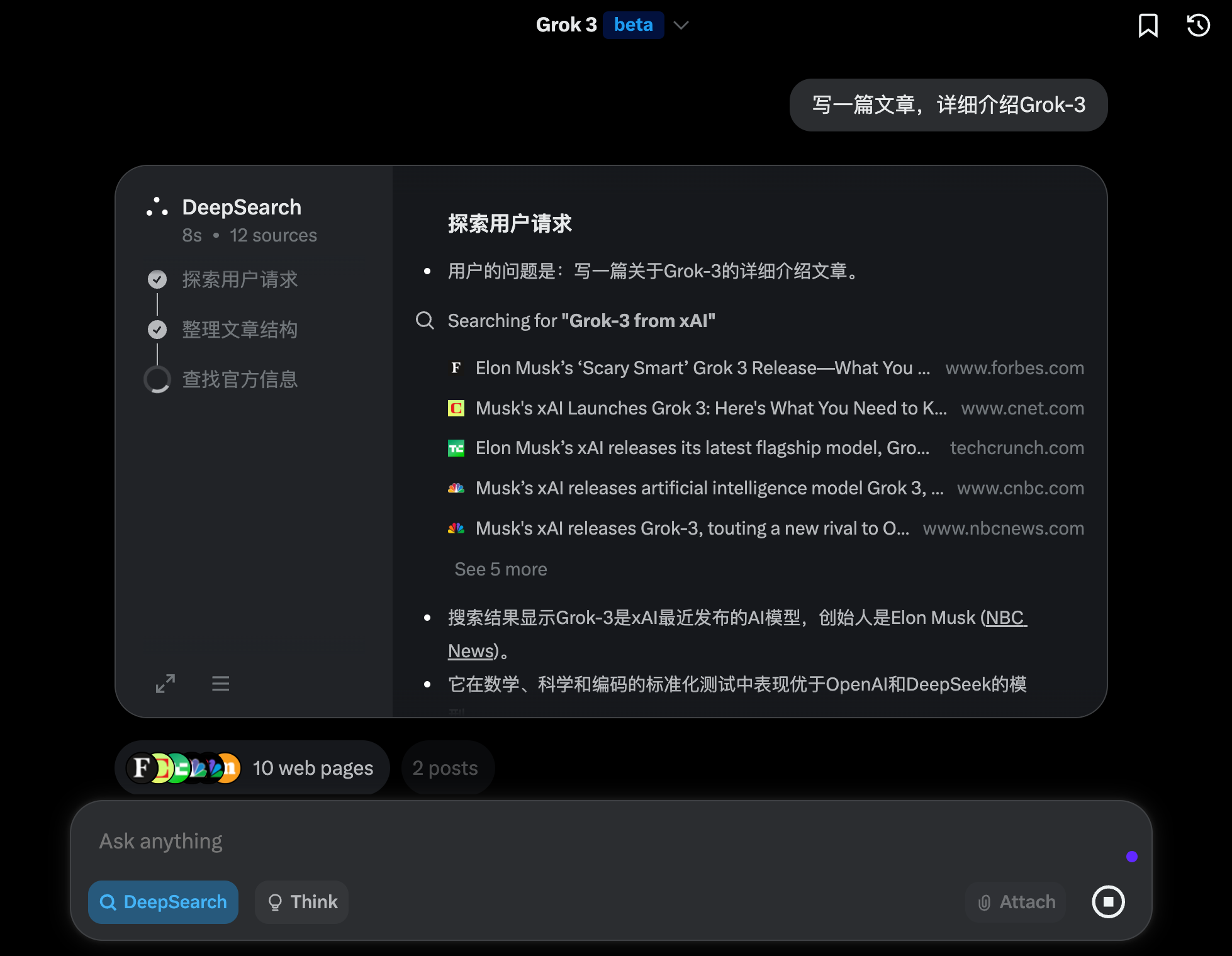 此外,Grok-3 配备了 DeepSearch 代理,这是一个创新功能,允许模型搜索互联网和 X 平台,以提供准确且最新的答案。DeepSearch 的演示显示,它可以分析 15 个 X 帖子和 32 个网页,并在约一分钟内生成详细的回答,展示其推理过程。