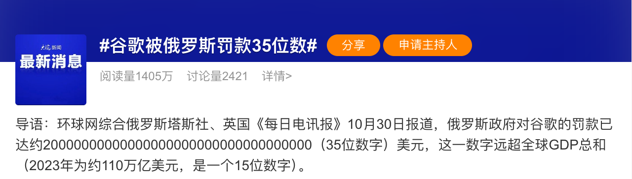 我的天哪!你们听说了吗?俄罗斯政府给谷歌开出了一张罚单,数额之大简直让人难以置信!据说高达 20000000000000000000000000000000000 美元,这个数字比全世界一年的 GDP 加起来还要多,太离谱了吧!