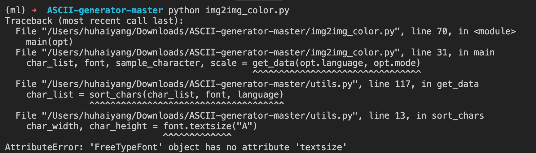 结果报错了,毕竟 6 年前的项目了。提示 FreeTypeFont 对象没有 getsize 方法。实际上,Pillow 库的 ImageFont 模块中,getsize 方法已经被弃用,应该使用 getbbox 方法来获取文本的尺寸。