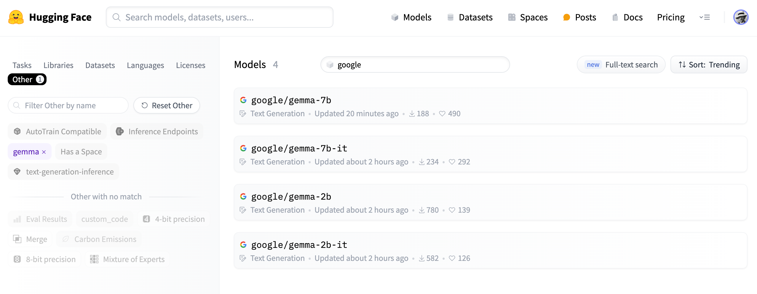 Gemma 简介:https://huggingface.co/blog/gemma Models 介绍:https://huggingface.co/models?other=gemma&sort=trending&search=google