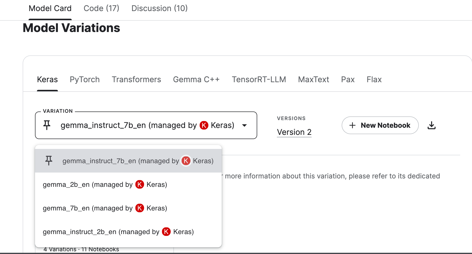 然后自动跳转后找到 Model Card 这里选择对应框架版本的 Gemma 即可